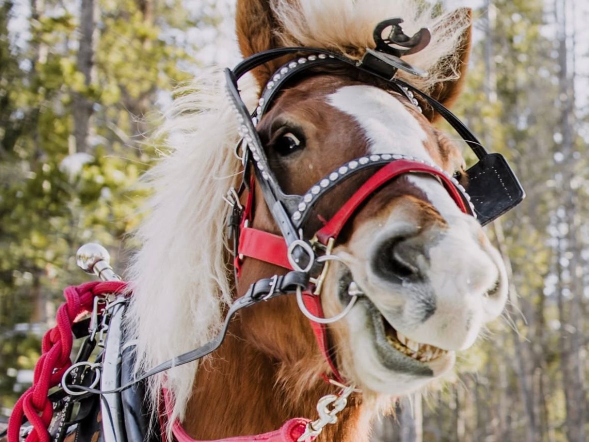 Two Belgian draft horses — strong, steady, and surprisingly sweet — are harnessed to pull a cherry-red wagon fitted with hay bales that can seat up to 20 guests. Rides are shared, so you might be joined by other mountain adventurers — but that just adds to the friendly, seasonal charm.